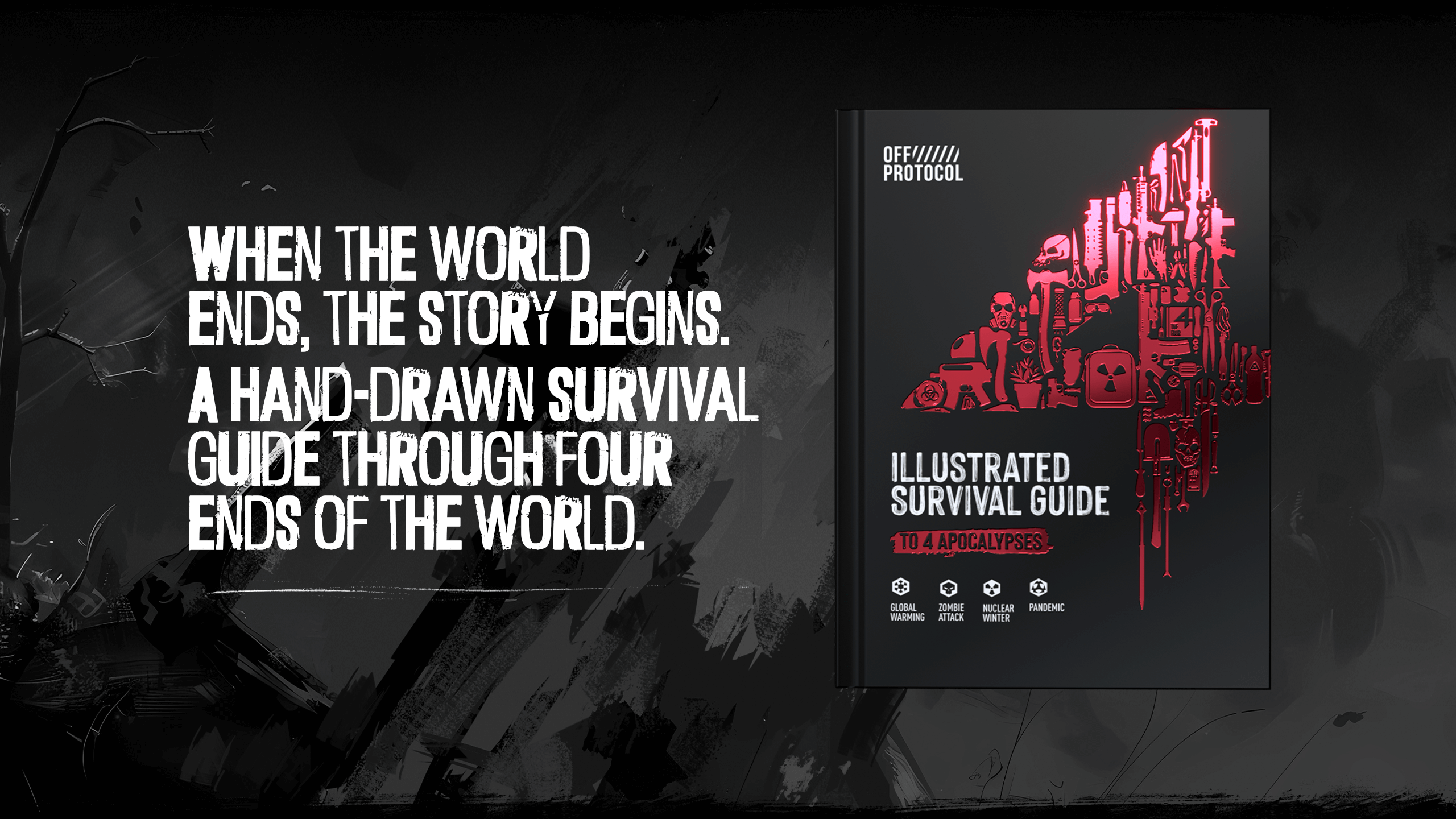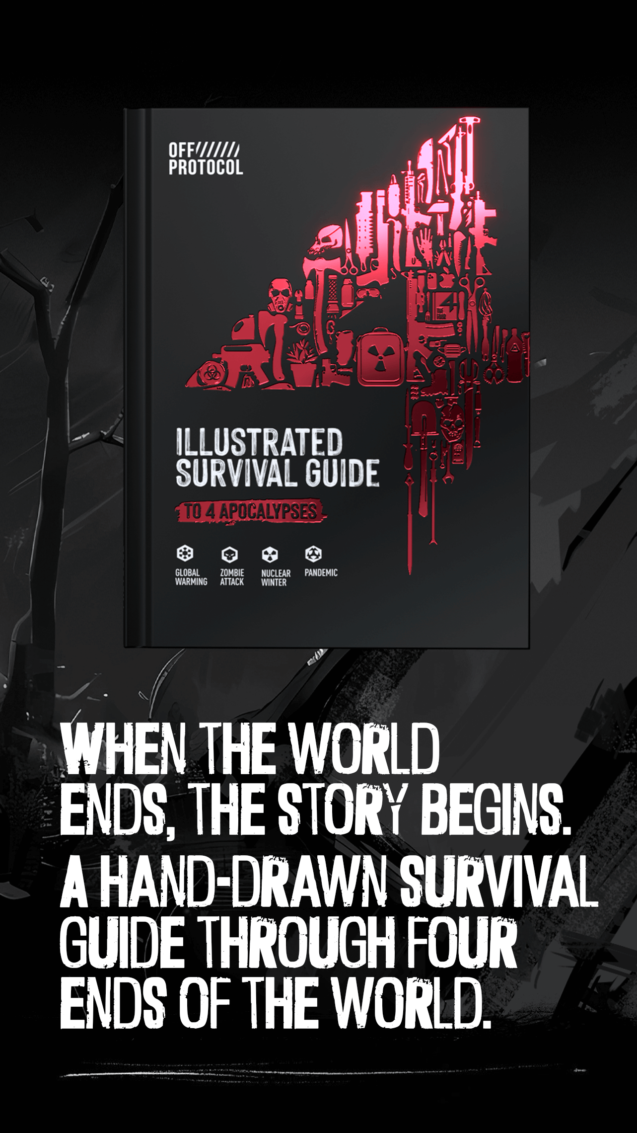 The flagship product of OFF PROTOCOL, The 4: Survive Through 4 Apocalypse Scenarios, is a meticulously hand-drawn, 400+ page illustrated survival guide—crafted entirely by artists and writers, with no AI involved. Each of its four chapters—Zombie, Pandemic, Global Warming, and Nuclear Winter—immerses readers in a unique, scientifically grounded world brought to life through stunning illustration and storytelling. Designed as a true collector’s piece, The 4 embodies OFF PROTOCOL’s commitment to authenticity, creativity, and craftsmanship—where every page reflects the art of human imagination at its finest.